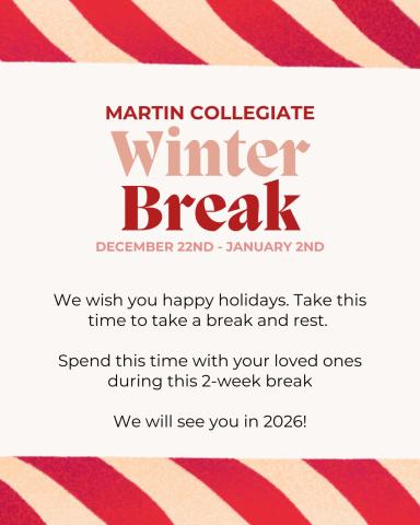 Martin Collegiate will be closed for students and staff from Monday, December 22, 2025 to Friday, January 2, 2026 for winter break.